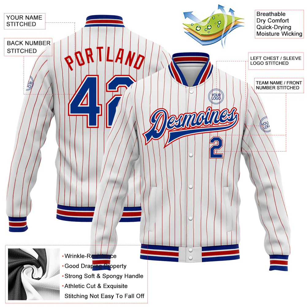 Custom White Red Pinstripe Royal Bomber Full-Snap Varsity Letterman Jacket