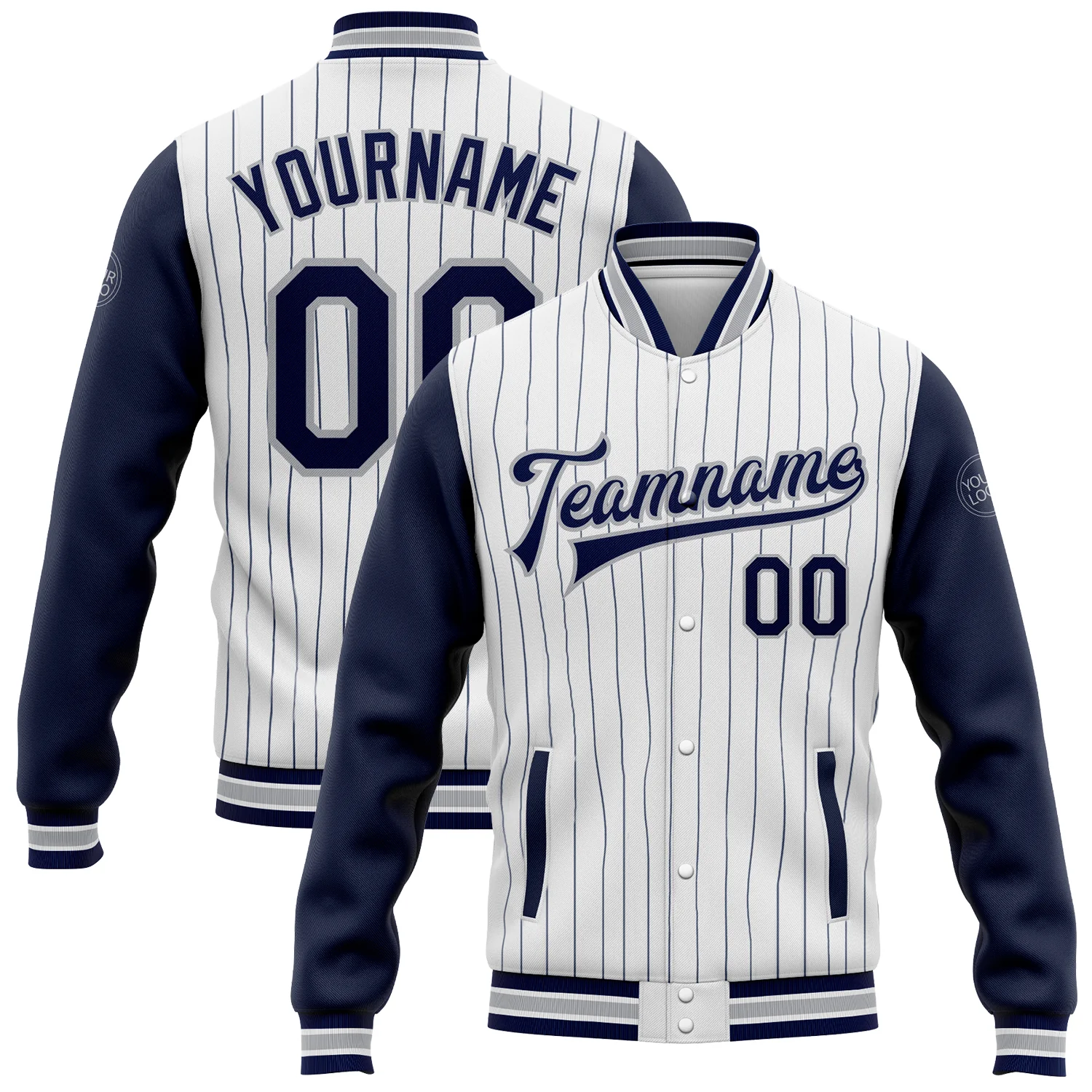 Custom White Navy Pinstripe Gray Bomber Full-Snap Varsity Letterman Two Tone Jacket