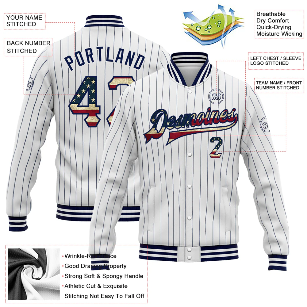 Custom White Navy Pinstripe Vintage USA Flag Bomber Full-Snap Varsity Letterman Jacket