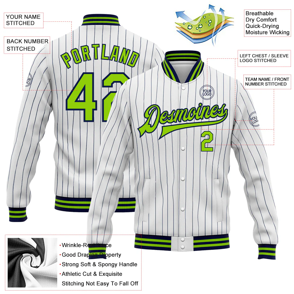 Custom White Navy Pinstripe Neon Green Bomber Full-Snap Varsity Letterman Jacket