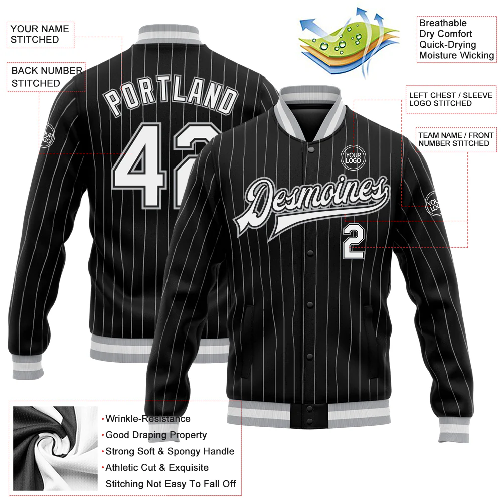 Custom Black White Pinstripe Gray Bomber Full-Snap Varsity Letterman Jacket