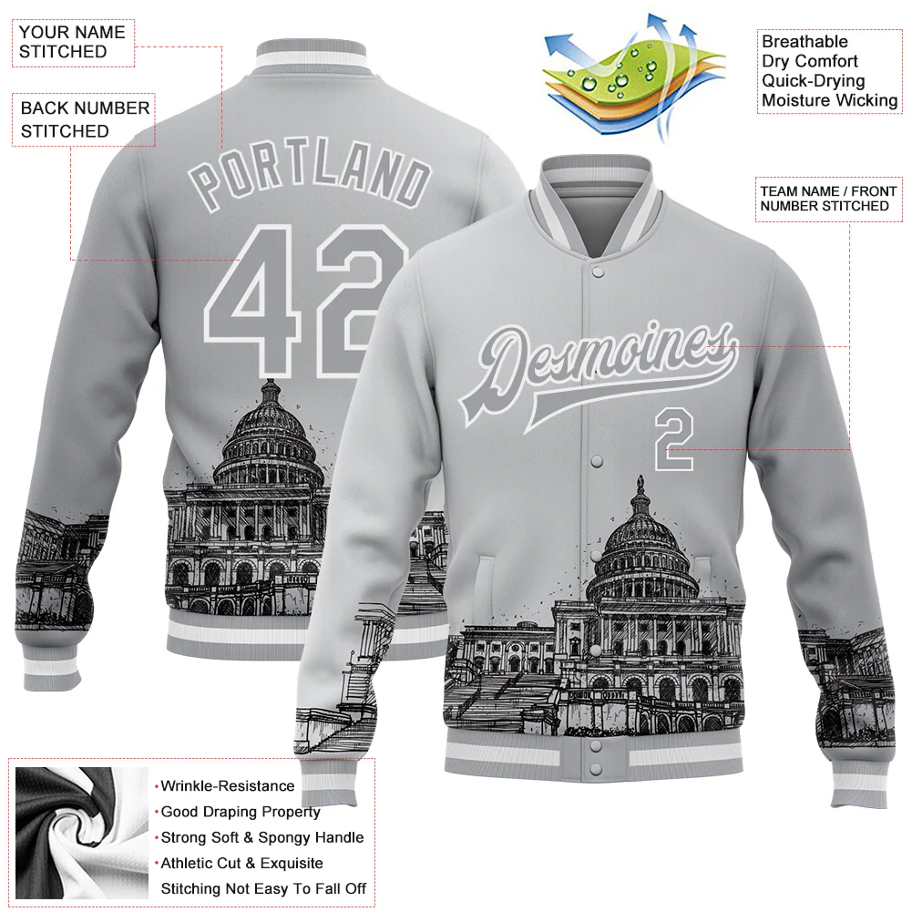 Custom Gray White-Black United States Capitol 3D Pattern Design Bomber Full-Snap Varsity Letterman Jacket
