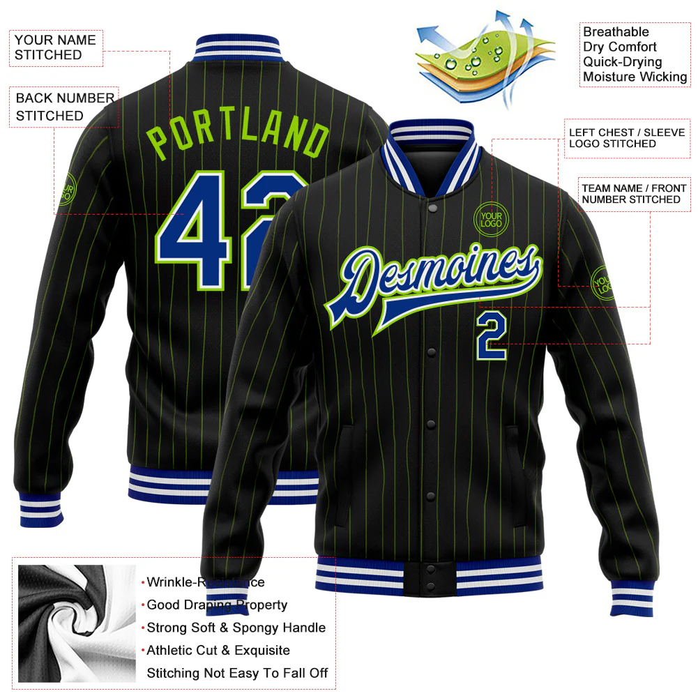 Custom Black Neon Green Pinstripe Royal-White Bomber Full-Snap Varsity Letterman Jacket