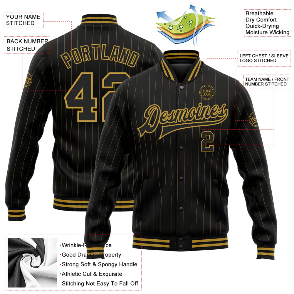 Custom Black Old Gold Pinstripe Old Gold Bomber Full-Snap Varsity Letterman Jacket