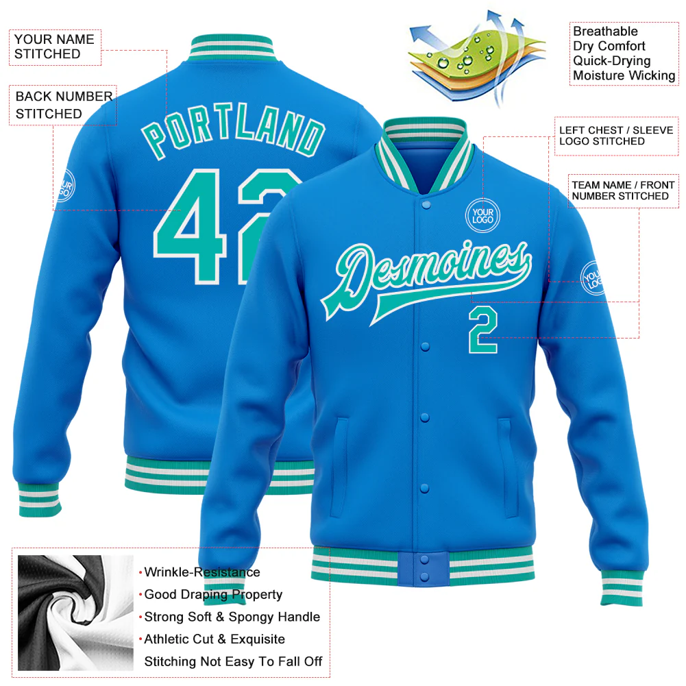 Custom Powder Blue Aqua-White Bomber Full-Snap Varsity Letterman Jacket