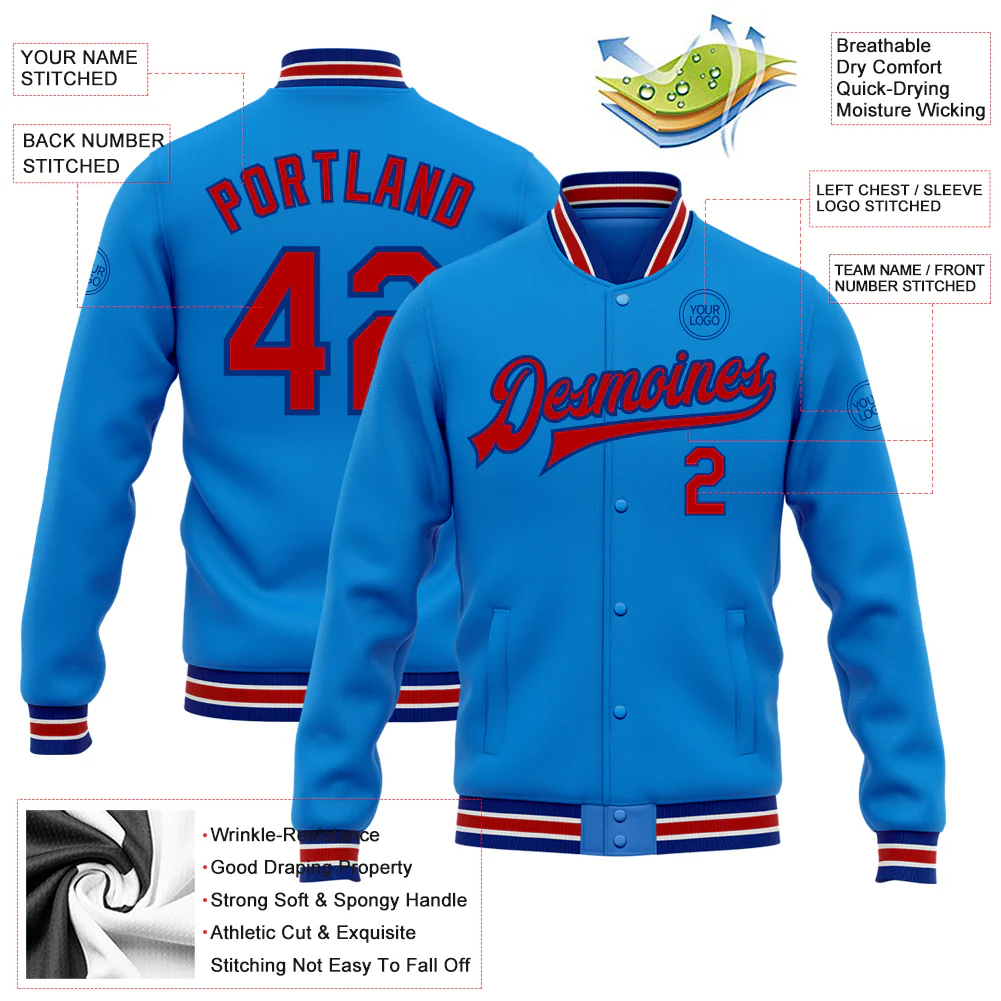 Custom Powder Blue Red-Royal Bomber Full-Snap Varsity Letterman Jacket
