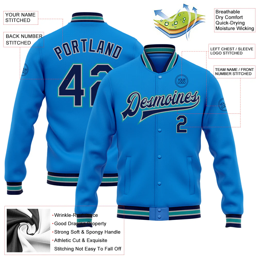 Custom Powder Blue Gray-Navy Bomber Full-Snap Varsity Letterman Jacket