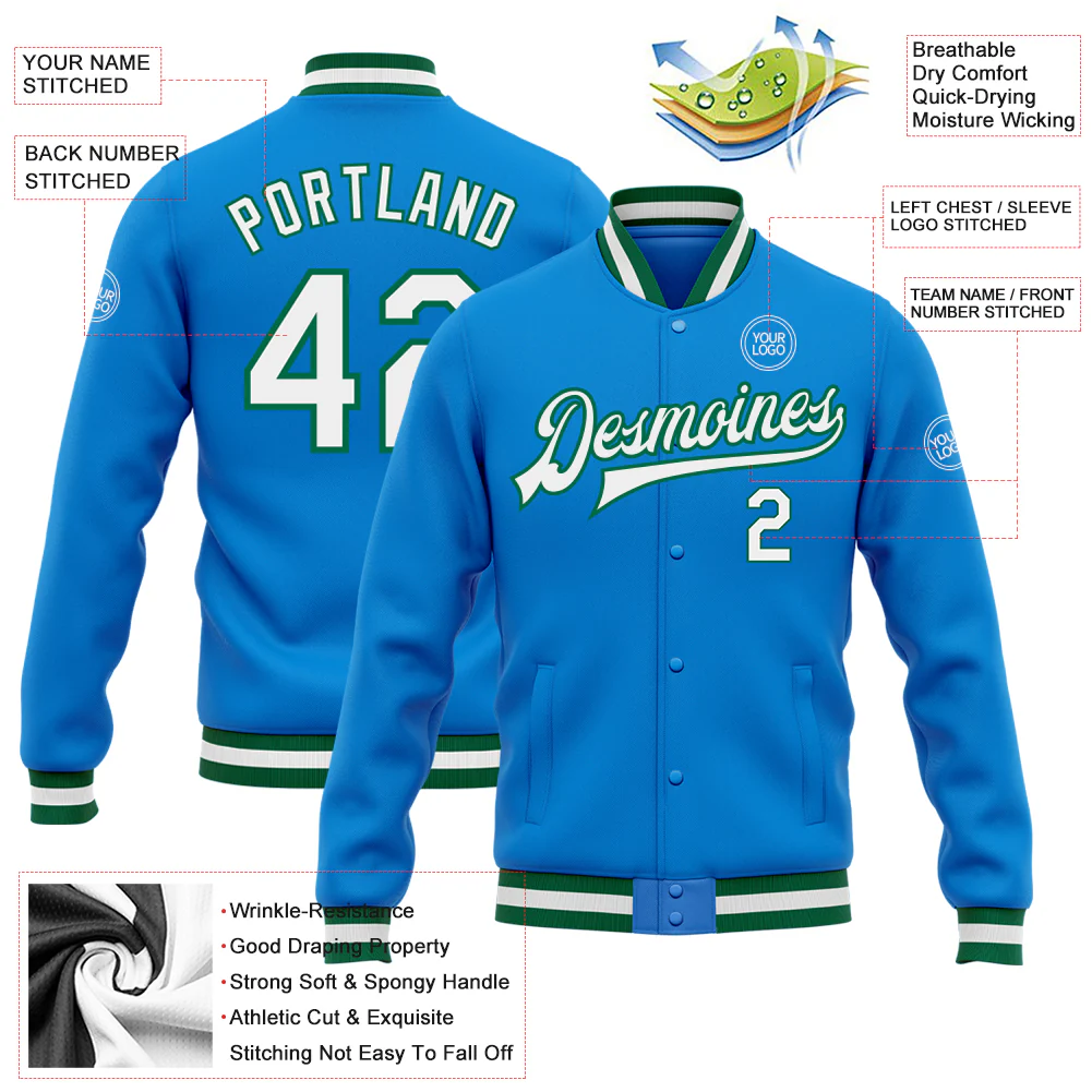 Custom Powder Blue White-Kelly Green Bomber Full-Snap Varsity Letterman Jacket