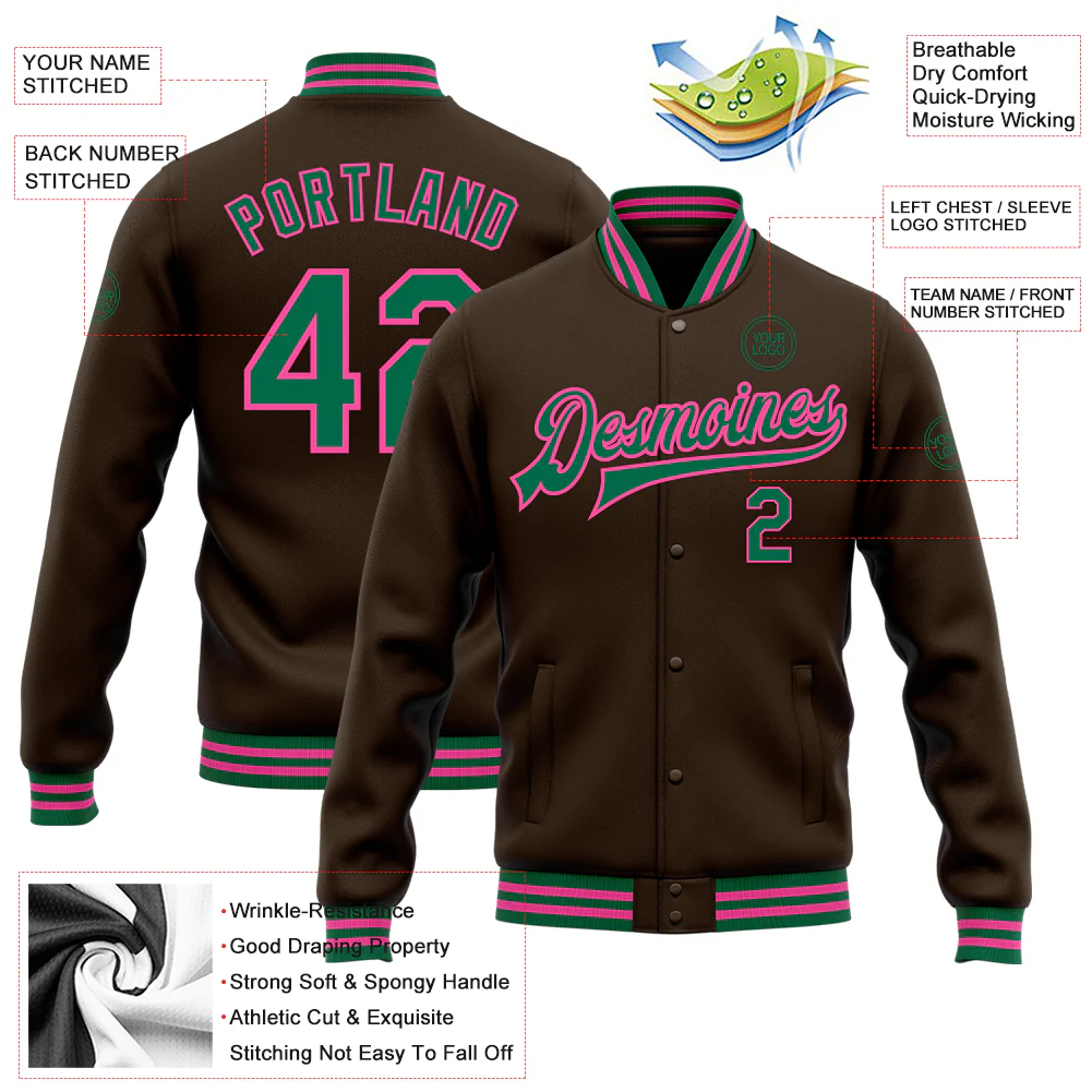 Custom Brown Kelly Green-Pink Bomber Full-Snap Varsity Letterman Jacket