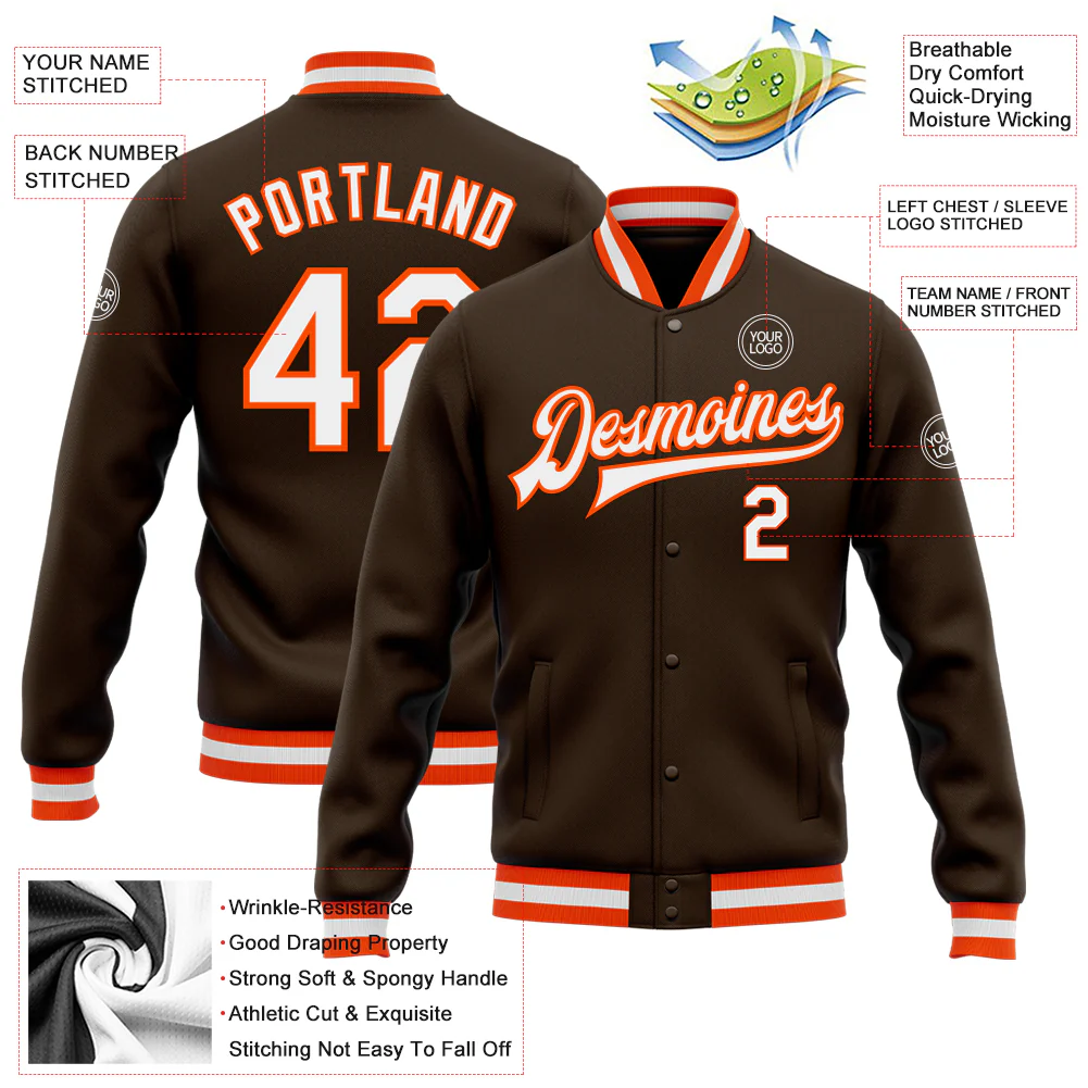 Custom Brown White-Orange Bomber Full-Snap Varsity Letterman Jacket