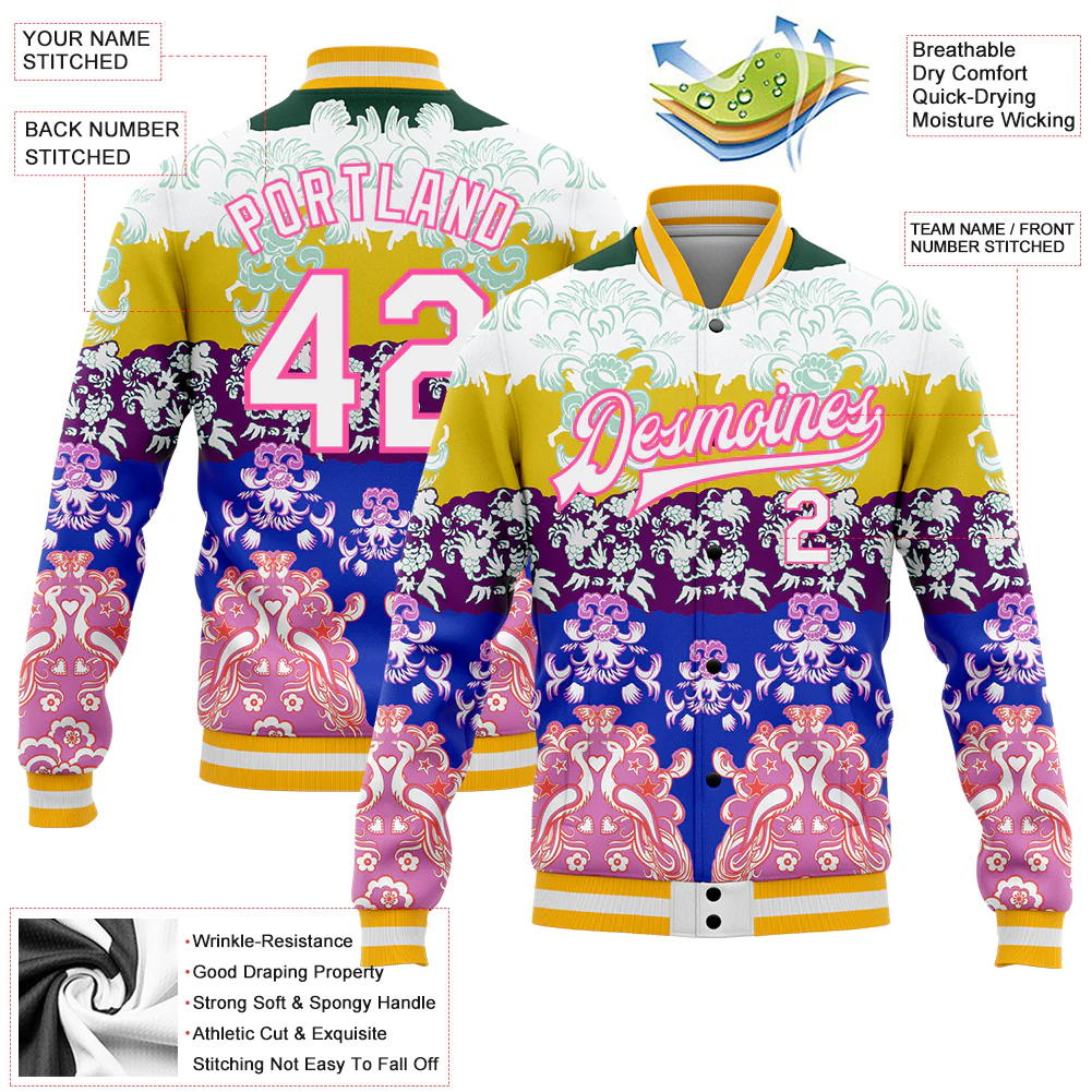 Custom White Pink-Gold Heron 3D Pattern Design Bomber Full-Snap Varsity Letterman Jacket
