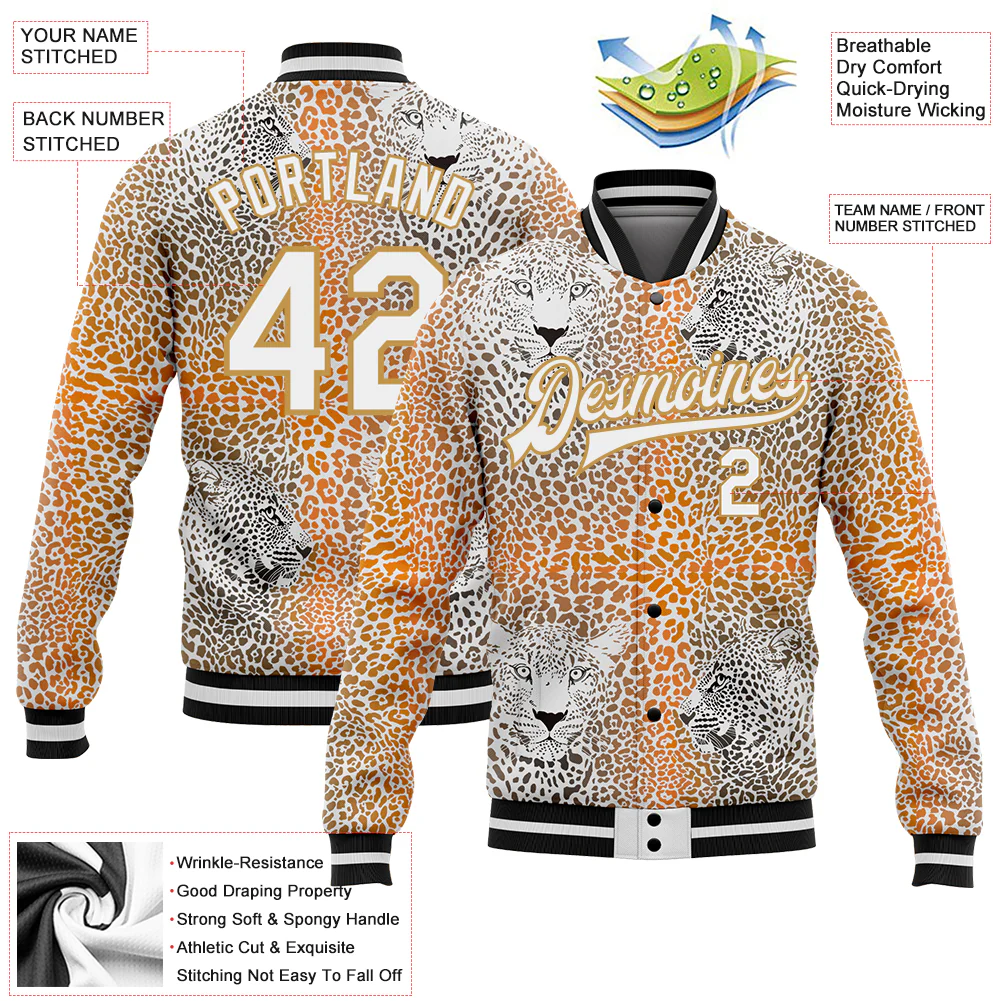 Custom Old Gold White-Black Leopard 3D Pattern Design Bomber Full-Snap Varsity Letterman Jacket