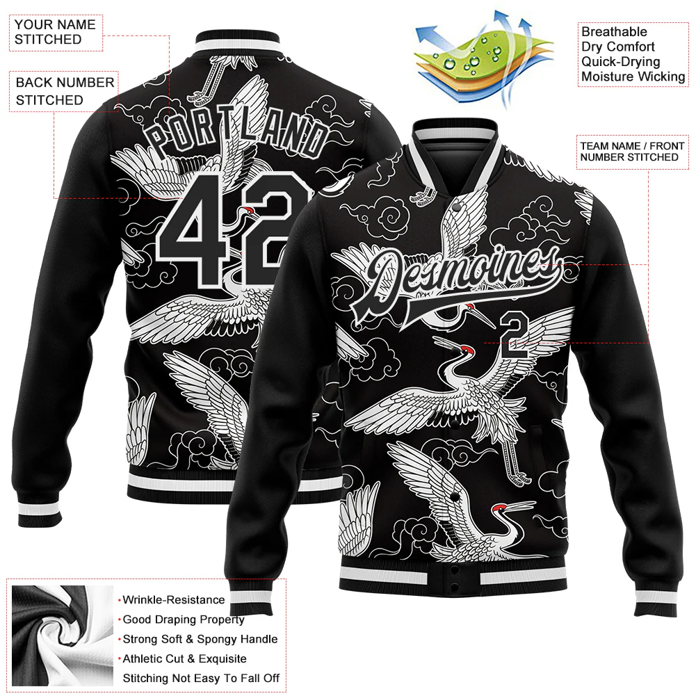 Custom Black White Heron And Cloud 3D Pattern Design Bomber Full-Snap Varsity Letterman Jacket