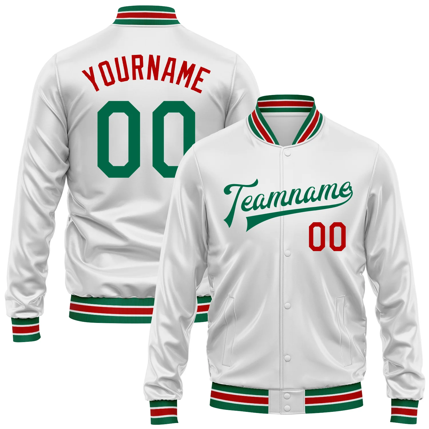 Custom White Kelly Green-Red Bomber Full-Snap Varsity Faux Leather Letterman Jacket