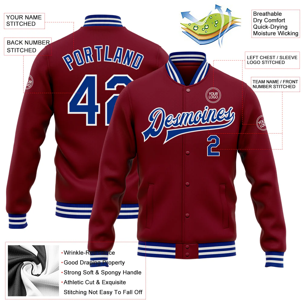 Custom Crimson Royal-White Bomber Full-Snap Varsity Letterman Jacket