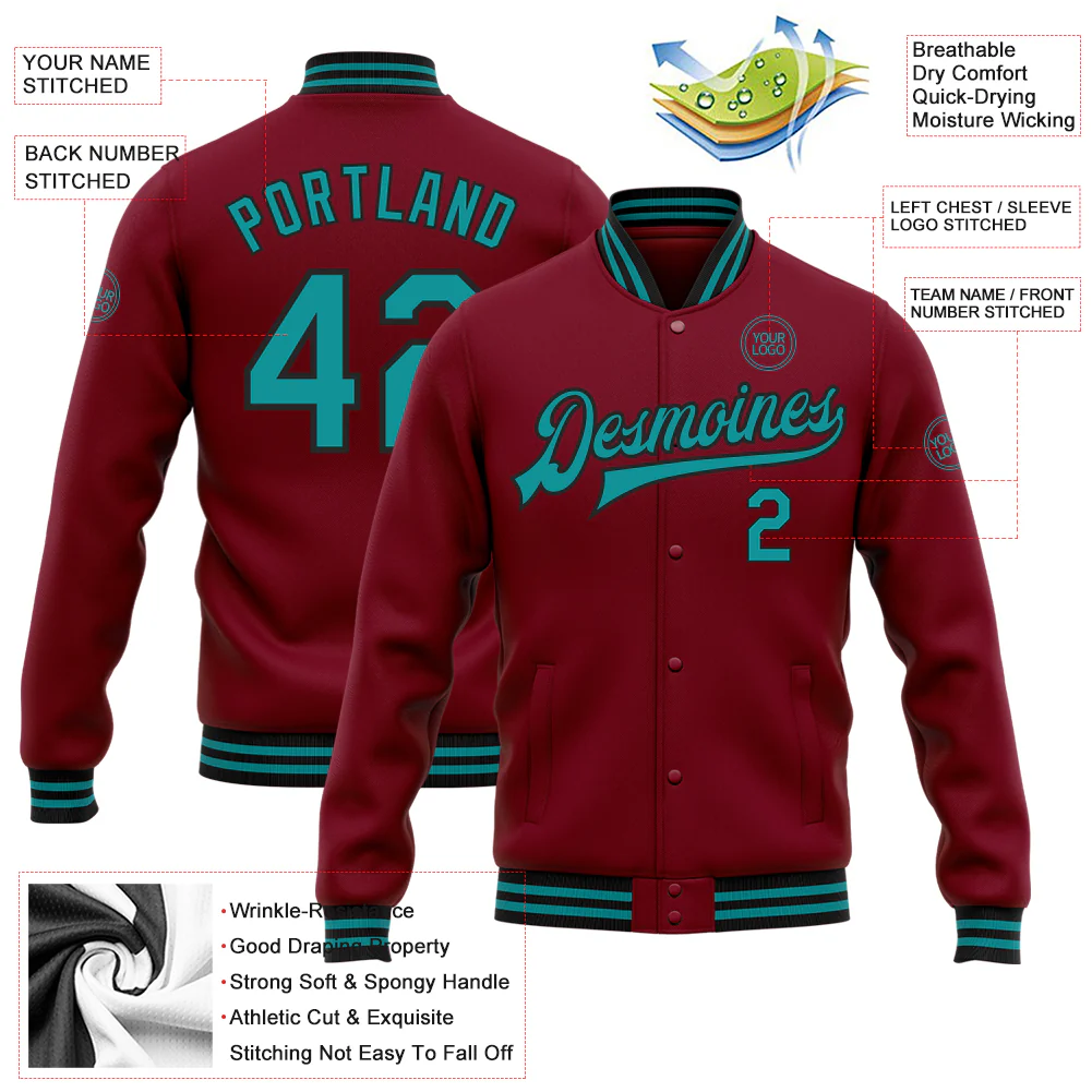 Custom Crimson Teal-Black Bomber Full-Snap Varsity Letterman Jacket