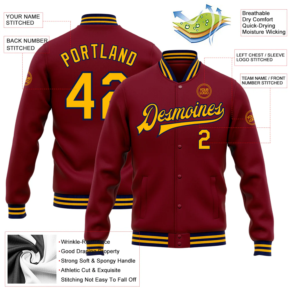 Custom Crimson Gold-Navy Bomber Full-Snap Varsity Letterman Jacket