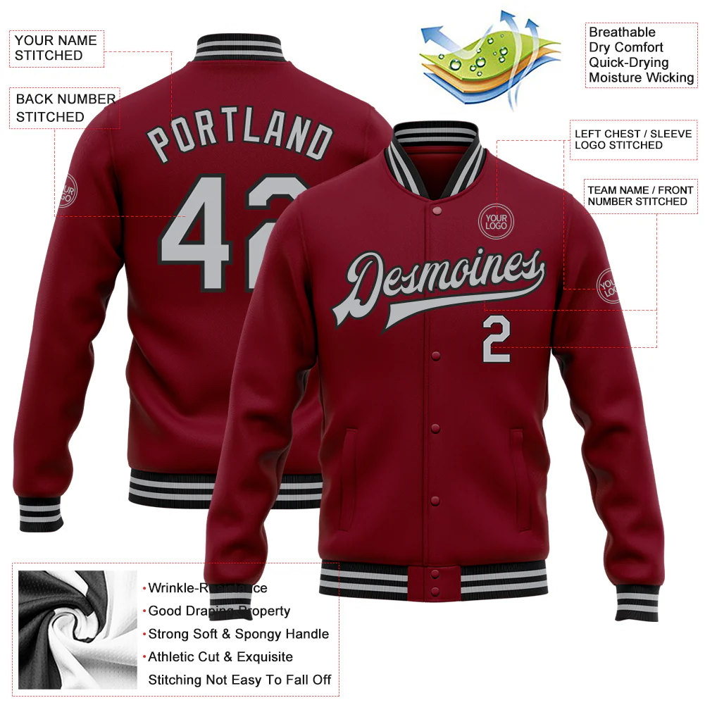 Custom Crimson Gray-Black Bomber Full-Snap Varsity Letterman Jacket