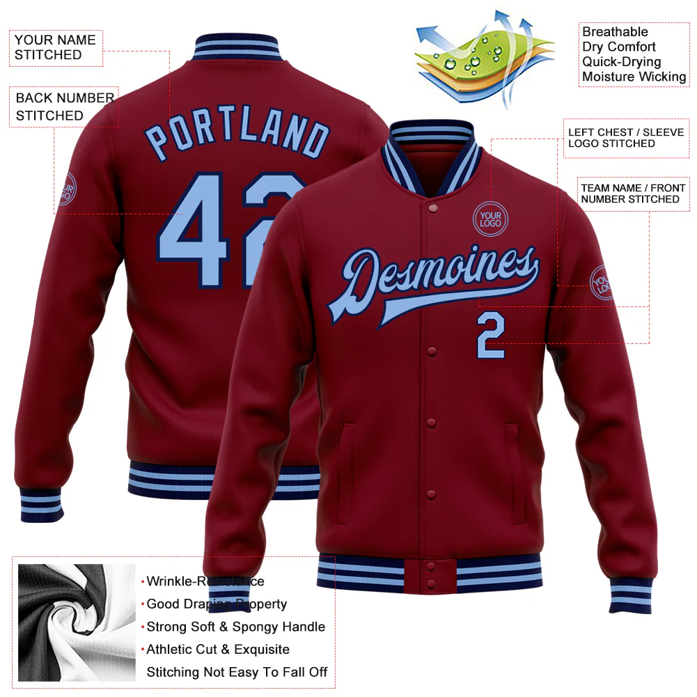 Custom Crimson Light Blue-Navy Bomber Full-Snap Varsity Letterman Jacket