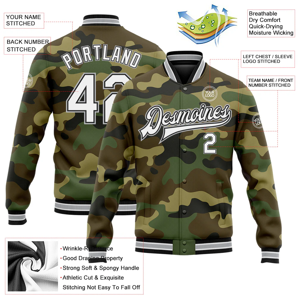 Custom Camo White Black-Gray Bomber Full-Snap Varsity Letterman Salute To Service Jacket