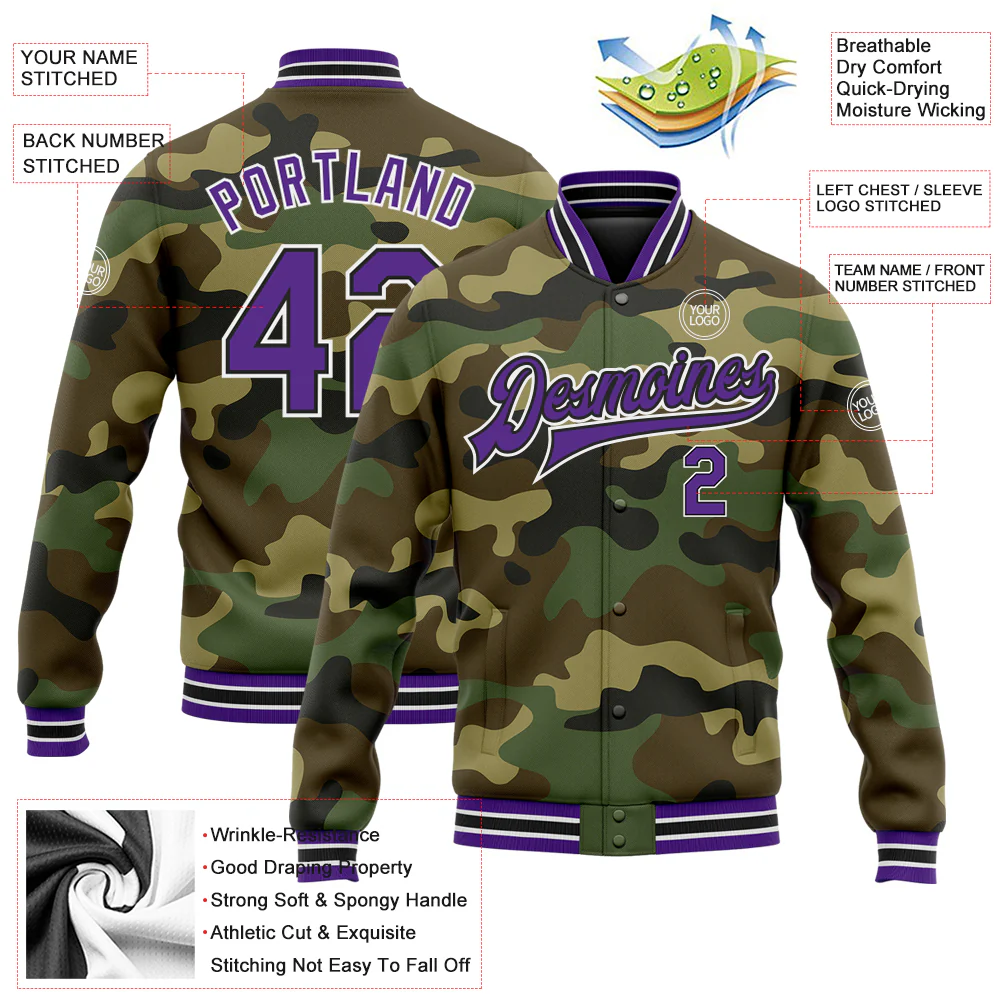 Custom Camo Purple-Black Bomber Full-Snap Varsity Letterman Salute To Service Jacket