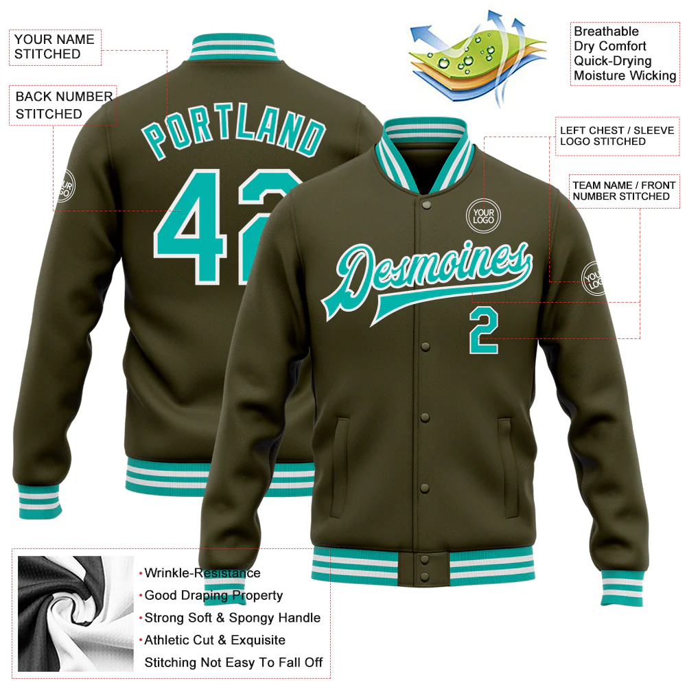 Custom Olive Aqua-White Bomber Full-Snap Varsity Letterman Salute To Service Jacket