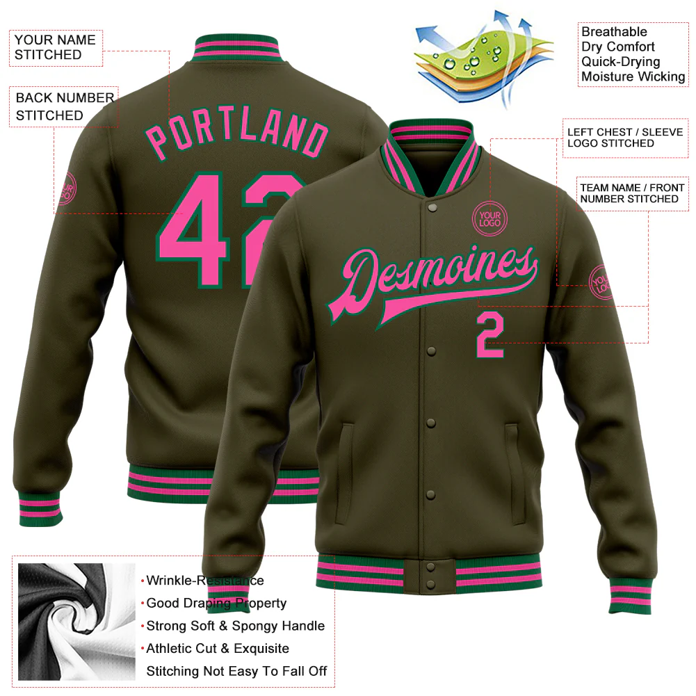 Custom Olive Pink-Kelly Green Bomber Full-Snap Varsity Letterman Salute To Service Jacket