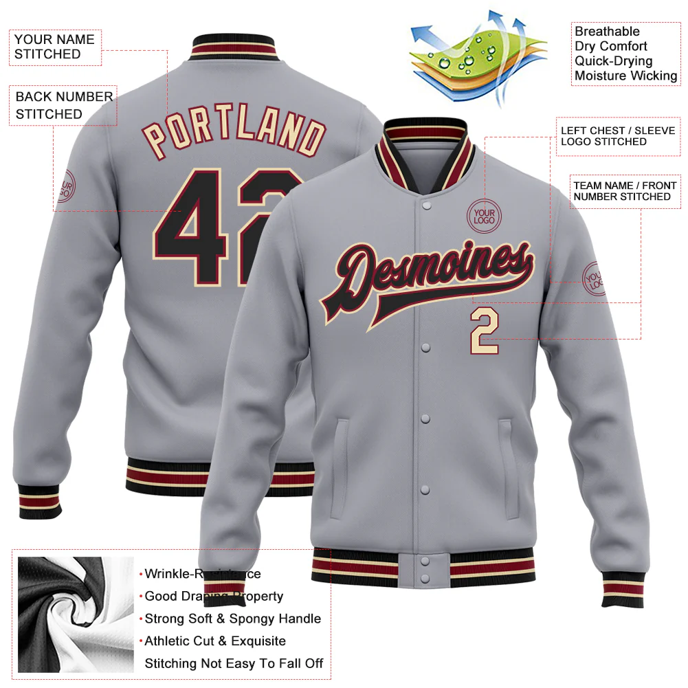 Custom Gray Black Crimson-City Cream Bomber Full-Snap Varsity Letterman Jacket