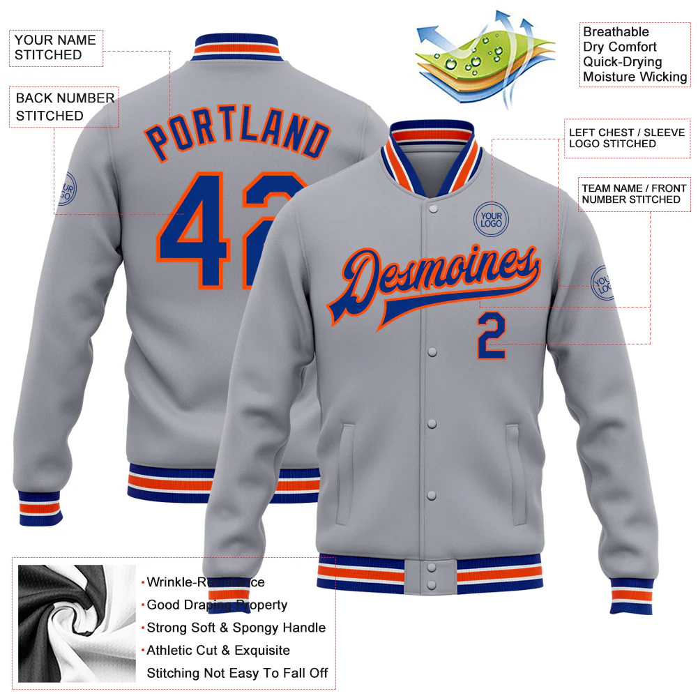 Custom Gray Royal-Orange Bomber Full-Snap Varsity Letterman Jacket