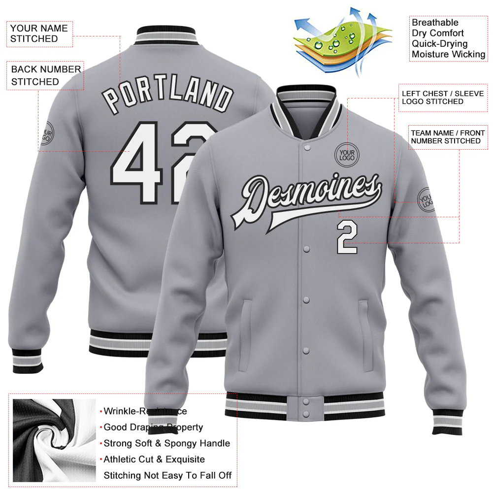 Custom Gray White-Black Bomber Full-Snap Varsity Letterman Jacket