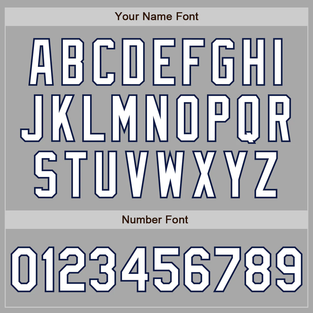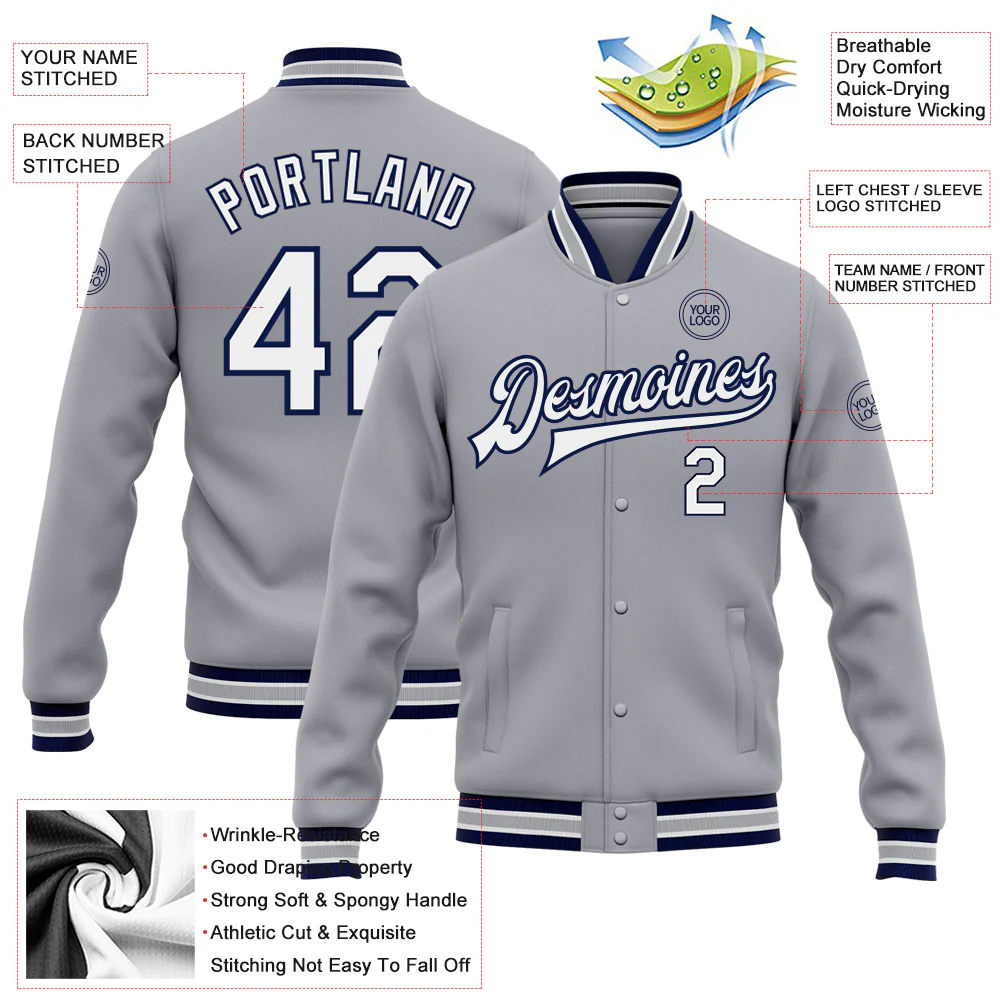 Custom Gray White-Navy Bomber Full-Snap Varsity Letterman Jacket