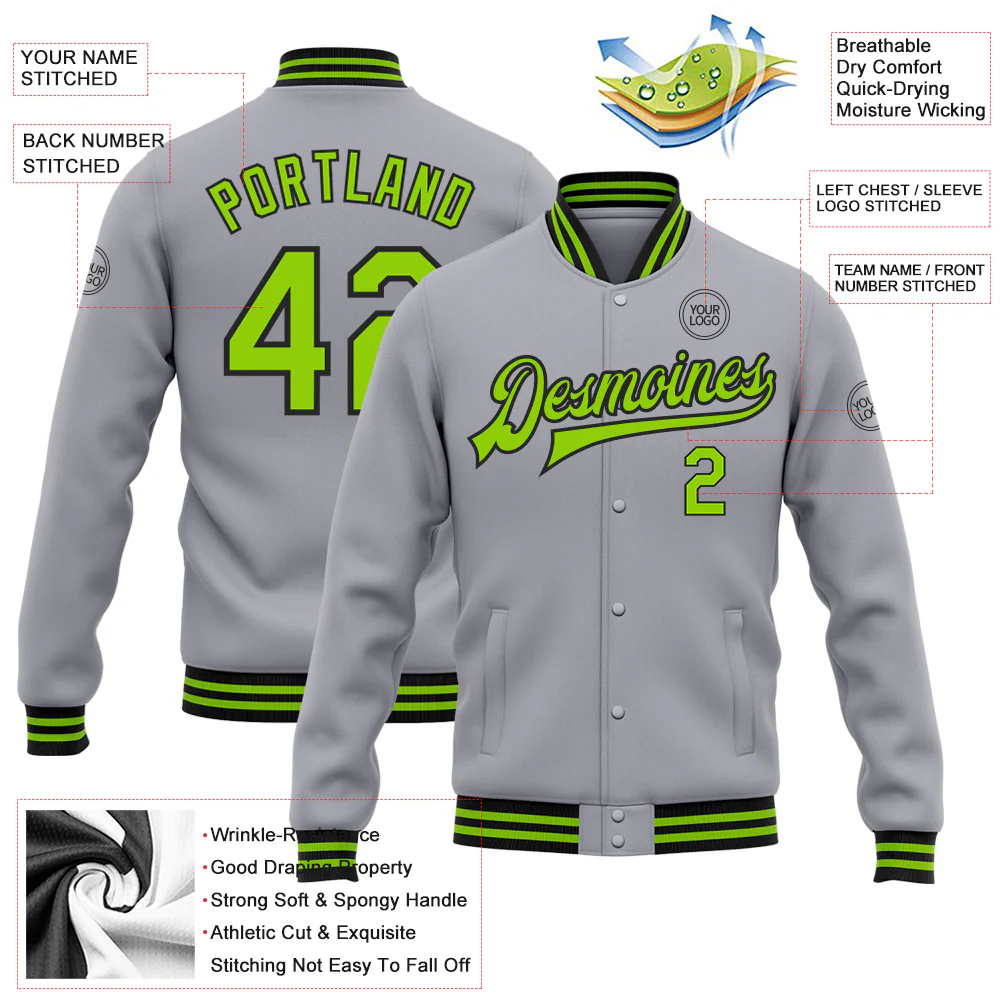 Custom Gray Neon Green-Black Bomber Full-Snap Varsity Letterman Jacket