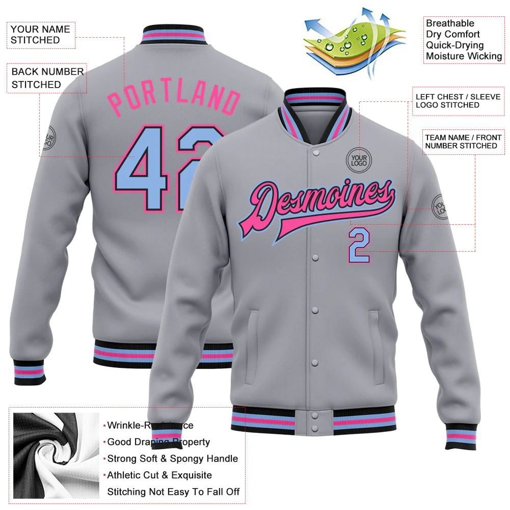 Custom Gray Light Blue Black-Pink Bomber Full-Snap Varsity Letterman Jacket