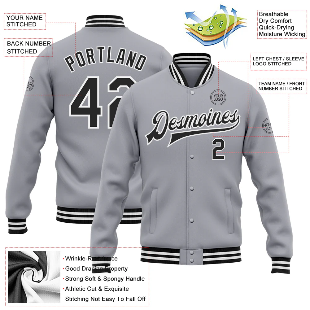 Custom Gray Black-White Bomber Full-Snap Varsity Letterman Jacket