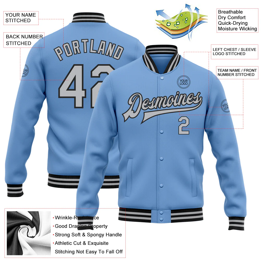 Custom Light Blue Gray-Black Bomber Full-Snap Varsity Letterman Jacket