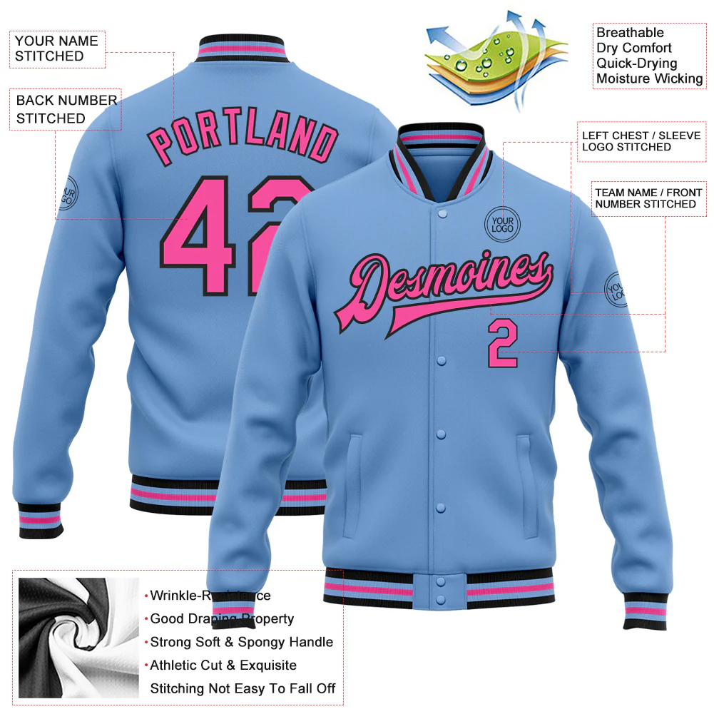 Custom Light Blue Pink-Black Bomber Full-Snap Varsity Letterman Jacket