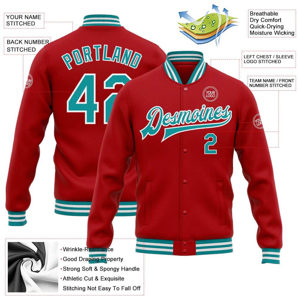 Custom Red Teal-White Bomber Full-Snap Varsity Letterman Jacket