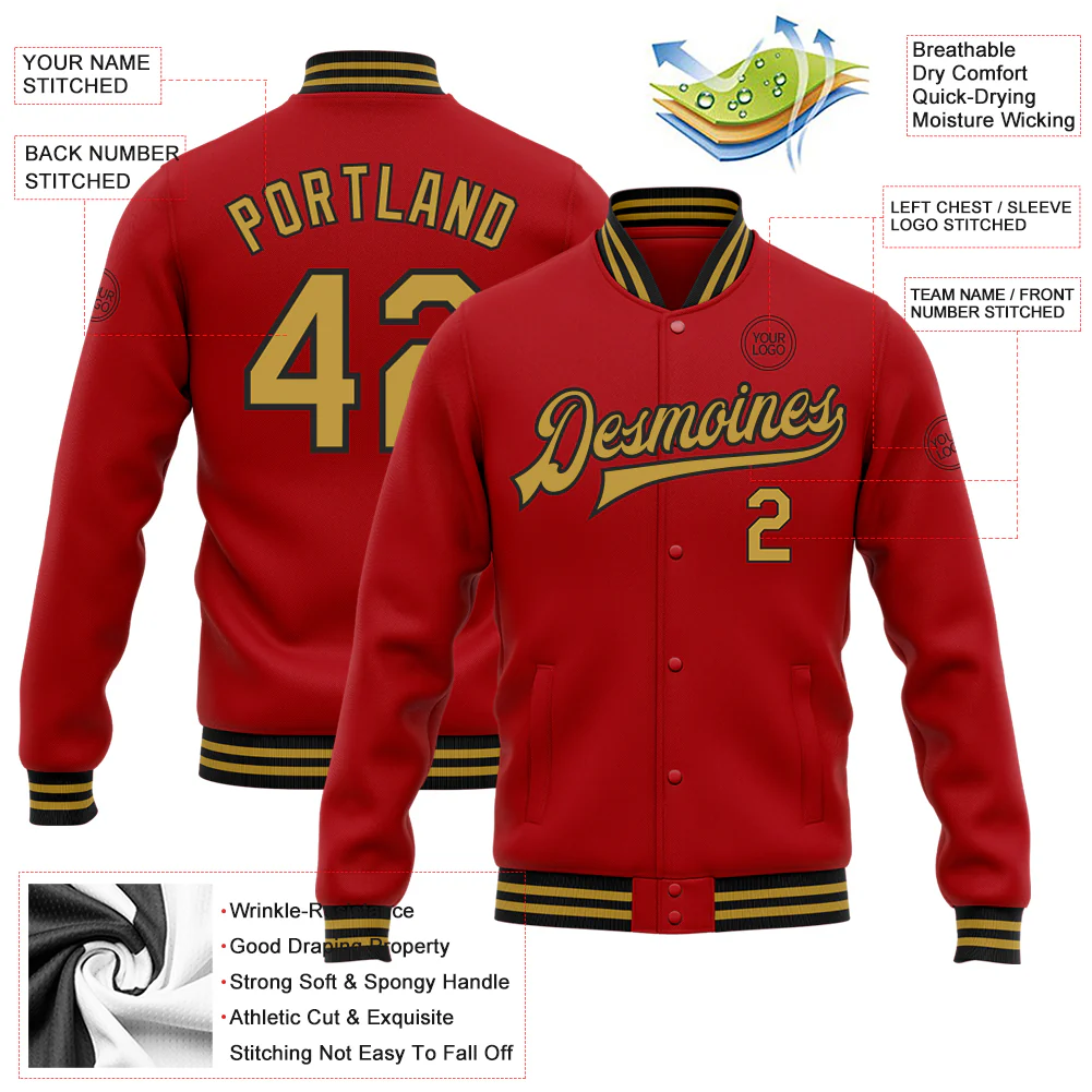 Custom Red Old Gold-Black Bomber Full-Snap Varsity Letterman Jacket