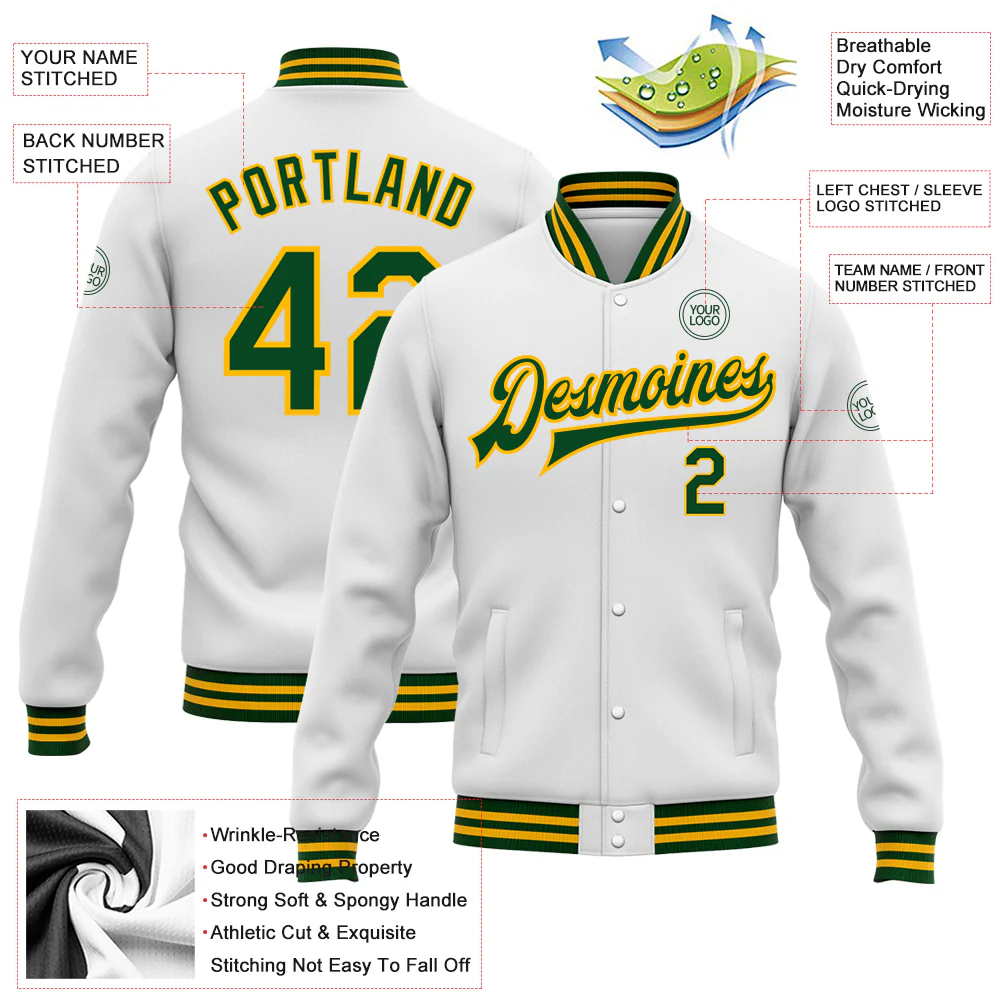 Custom White Green-Gold Bomber Full-Snap Varsity Letterman Jacket