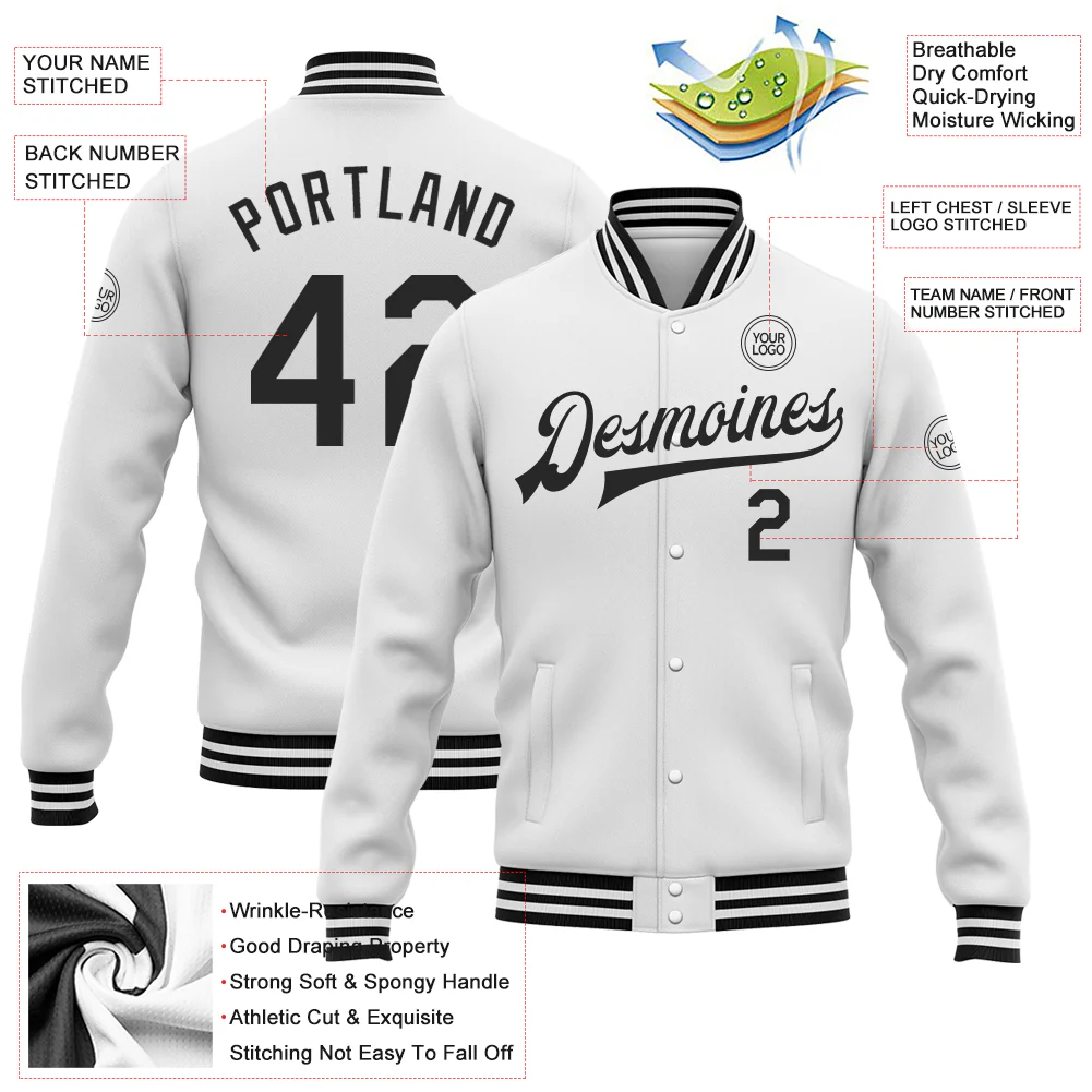 Custom White Black Bomber Full-Snap Varsity Letterman Jacket