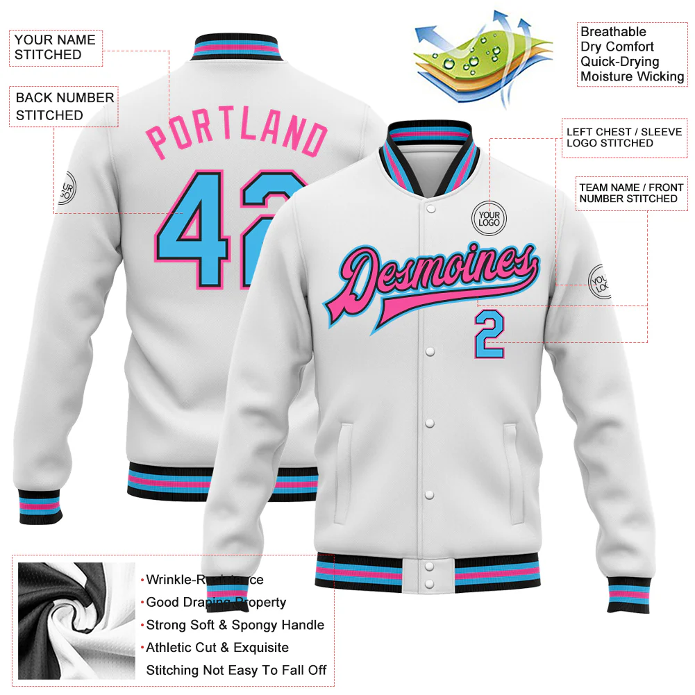 Custom White Sky Blue Black-Pink Bomber Full-Snap Varsity Letterman Jacket