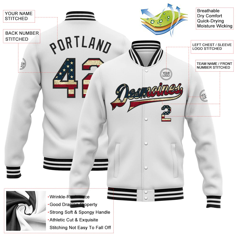 Custom White Vintage USA Flag-Black Bomber Full-Snap Varsity Letterman Jacket