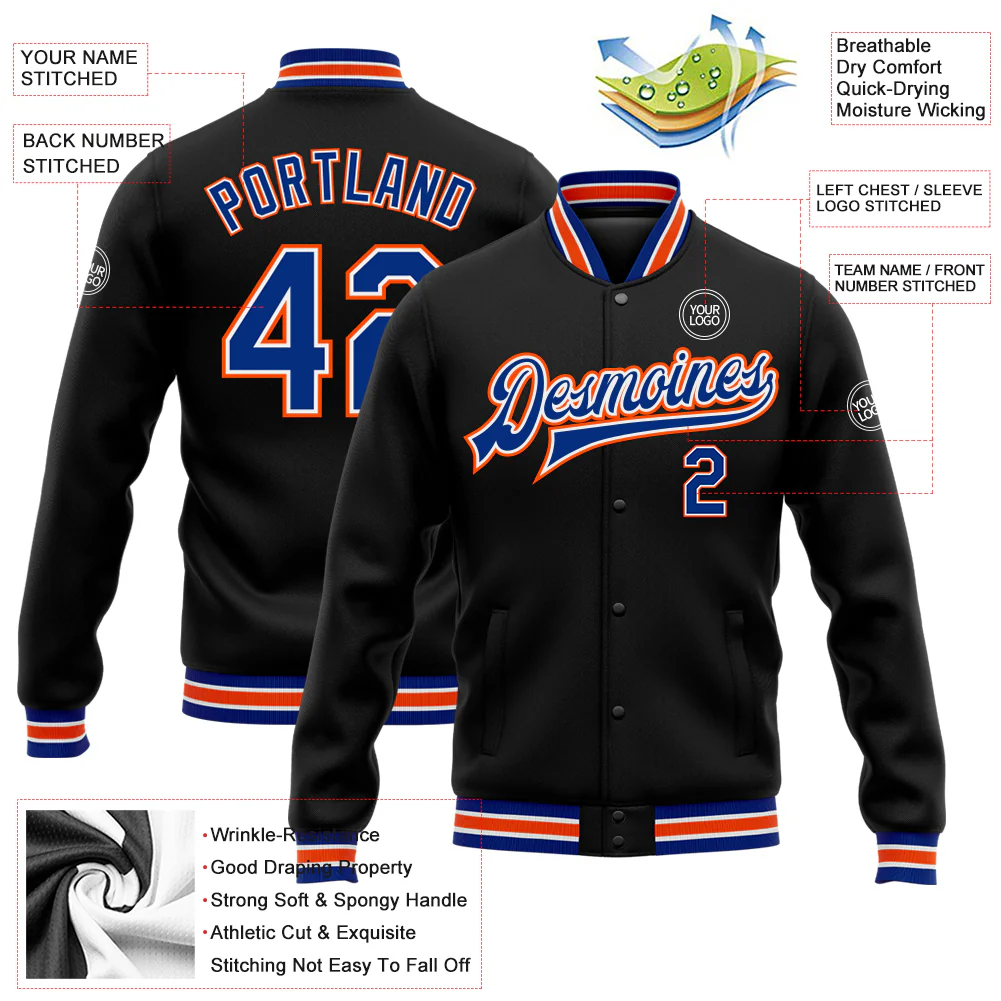 Custom Black Royal-Orange Bomber Full-Snap Varsity Letterman Jacket