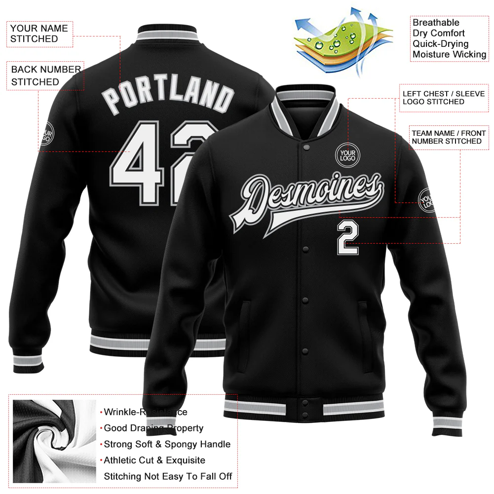 Custom Black White-Gray Bomber Full-Snap Varsity Letterman Jacket