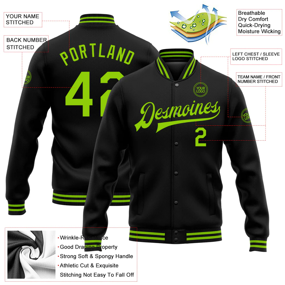 Custom Black Neon Green Bomber Full-Snap Varsity Letterman Jacket