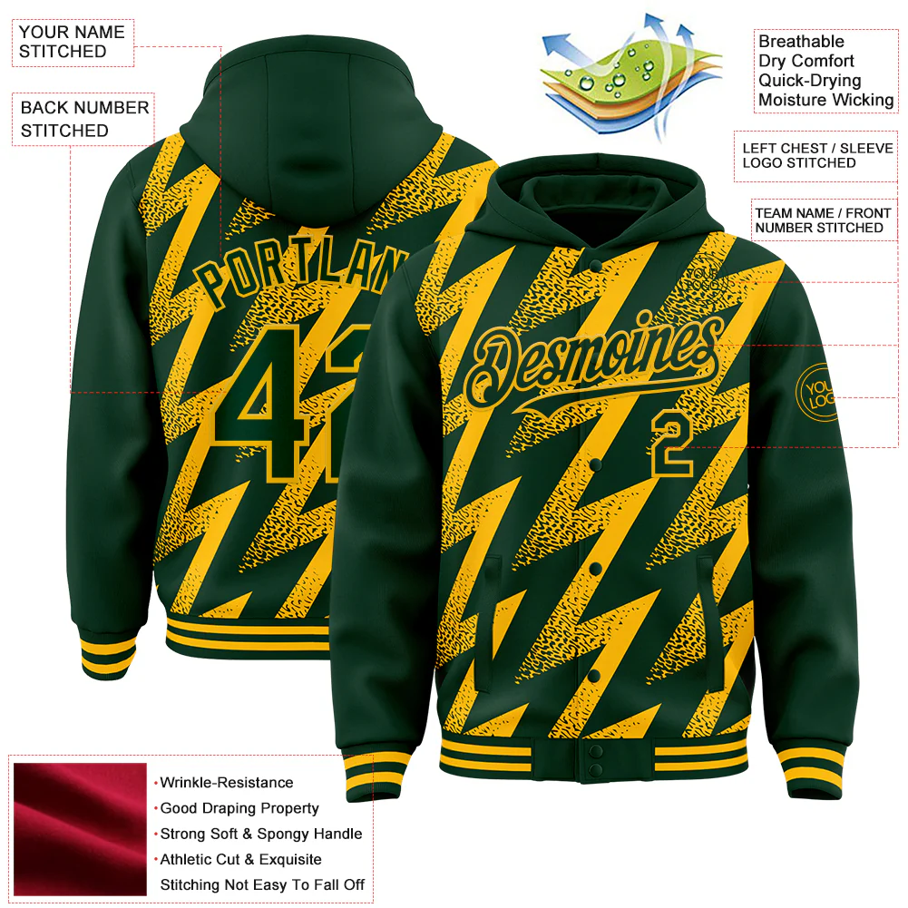 Custom Green Gold Zigzag Shape 3D Pattern Design Bomber Full-Snap Varsity Letterman Hoodie Jacket