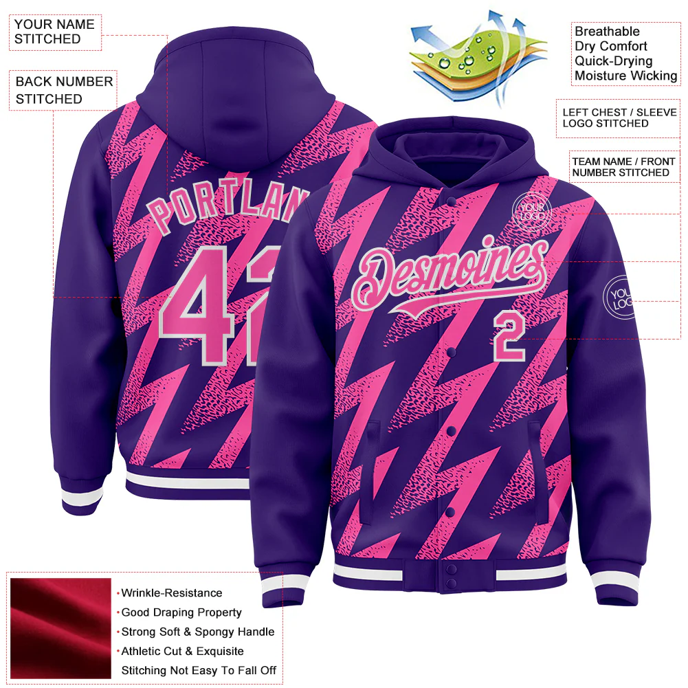 Custom Purple Pink-White Zigzag Shape 3D Pattern Design Bomber Full-Snap Varsity Letterman Hoodie Jacket