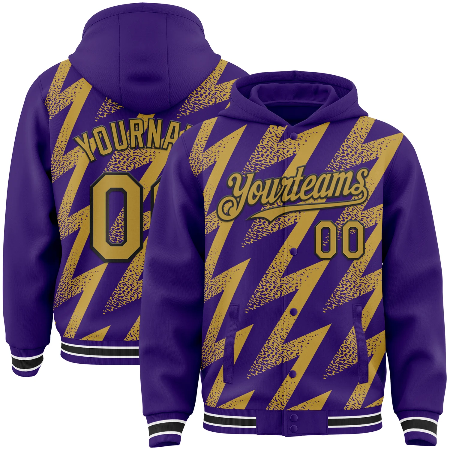 Custom Purple Gold-White Zigzag Shape 3D Pattern Design Bomber Full-Snap Varsity Letterman Hoodie Jacket