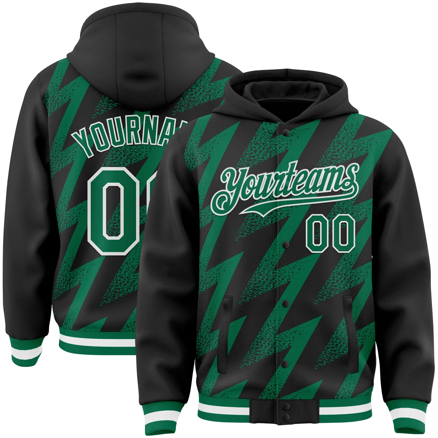 Custom Black Kelly Green-White Zigzag Shape 3D Pattern Design Bomber Full-Snap Varsity Letterman Hoodie Jacket