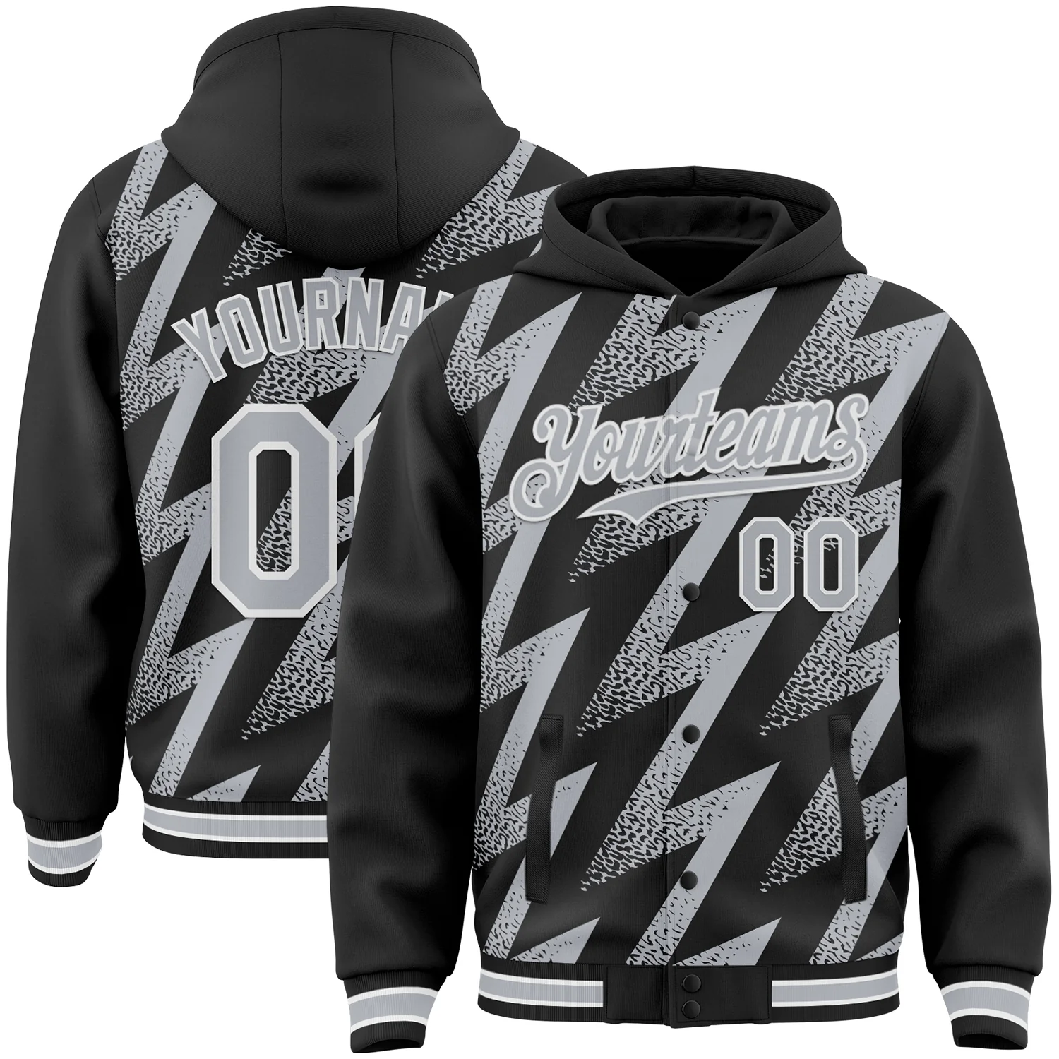 Custom Black Gray-White Zigzag Shape 3D Pattern Design Bomber Full-Snap Varsity Letterman Hoodie Jacket